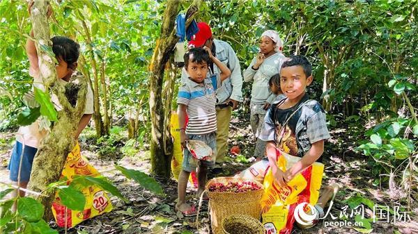 在中國駐東使館援助下,基里萊洛村咖啡產(chǎn)量大幅提高,圖為村民正在采收咖啡。人民網(wǎng)記者 孫廣勇 攝