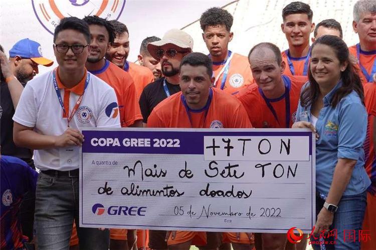 人民網(wǎng)巴西瑪瑙斯11月6日電 (記者吳杰)11名巴西國(guó)家隊(duì)前隊(duì)員、曾舉辦第20屆世界杯的足球賽場(chǎng)、35名銷售精英作為球員參賽、2000名觀眾自帶逾7噸食物……2022世界杯前夕,一串?dāng)?shù)字和獨(dú)特的足球賽吸引了人們的目光。當(dāng)?shù)貢r(shí)間11月5日,首屆COPA GREE(格力杯)明星足球賽在瑪瑙斯亞馬孫競(jìng)技場(chǎng)成功舉辦。澤·羅伯托等巴西國(guó)家隊(duì)前隊(duì)員及格力銷售精英參加對(duì)壘,當(dāng)?shù)赜^眾以“食品代門票”,自發(fā)攜帶食物到場(chǎng),共同向世界杯致敬,向當(dāng)?shù)刎毨和瞰I(xiàn)愛心。