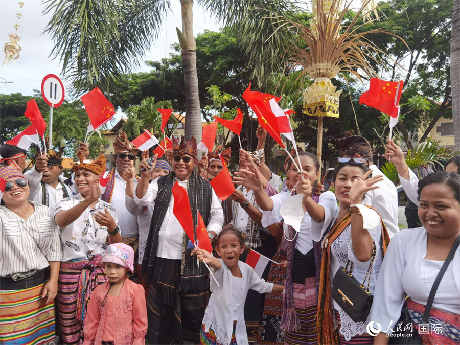 國家主席習近平當?shù)貢r間14日下午抵達印度尼西亞巴厘島,出席二十國集團領(lǐng)導人第十七次峰會。圖為熱情的巴厘島當?shù)鼐用裨跉g迎習近平主席。人民網(wǎng)記者 溫紅彥攝
