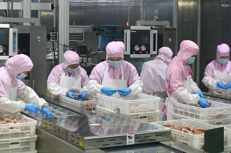 ↑11月16日,在福州元洪投資區(qū),福建御冠食品有限公司員工在食品生產(chǎn)線上檢驗(yàn)食品質(zhì)量。