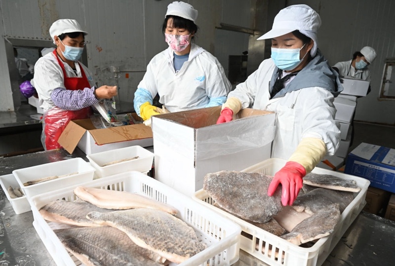 ↑11月16日,在福州元洪投資區(qū),福建淼天匯食品有限公司員工在包裝印尼深海魚產(chǎn)。