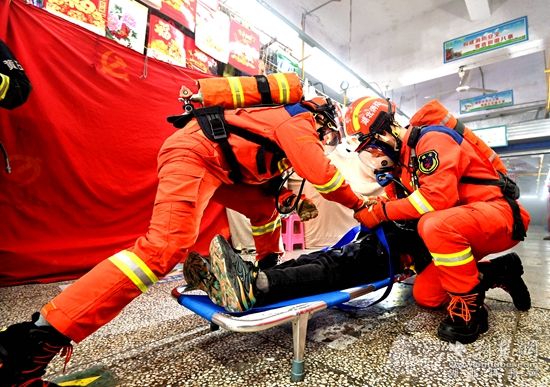 此次演練模擬上窯新安綜合批發(fā)市場A區(qū)一門面因使用取暖器引燃窗簾而引發(fā)火災,火勢迅速蔓延,形成大面積火災,火勢封閉疏散通道,有2人被困。