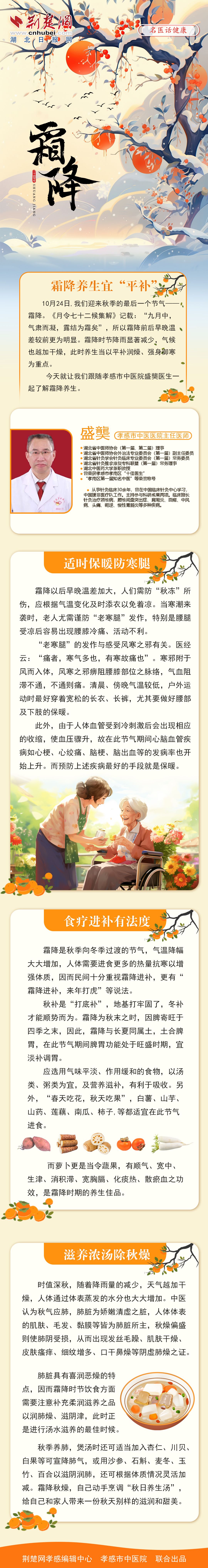 10月24日,我們迎來秋季的最后一個節(jié)氣一一霜降?!对铝钇呤蚣狻酚涊d:“九月中,氣肅而凝,露結為霜矣”,所以霜降前后早晚溫差較前更為明顯。霜降時節(jié)降雨顯著減少,氣候也越加干燥,此時養(yǎng)生當以平補潤燥、強身御寒為重點。今天就讓我們跟隨孝感市中醫(yī)院盛龑醫(yī)生一起了解霜降養(yǎng)生。