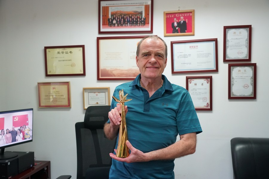 大衛(wèi)·弗格森在辦公室向記者展示他所獲得的蘭花獎(jiǎng)獎(jiǎng)杯。新華社記者 朱昊晨 攝
