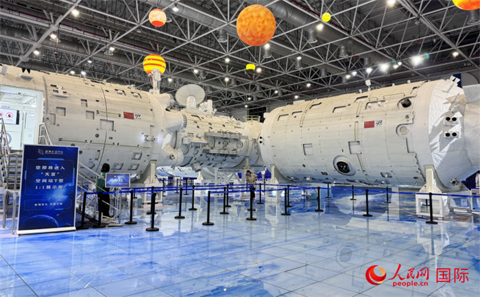 | 珠海太空中心內(nèi)陳列著全國(guó)獨(dú)有的“天宮”空間站T型1:1展示艙,游客可進(jìn)入內(nèi)部深度體驗(yàn)。人民網(wǎng)記者 張麗鷗攝 |