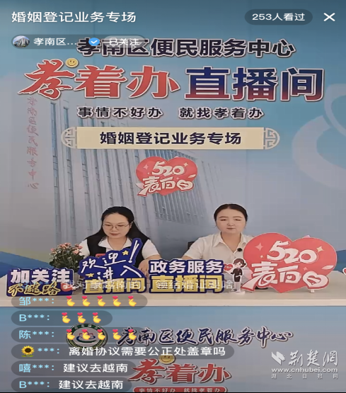荊楚網(wǎng)(湖北日?qǐng)?bào)網(wǎng))訊(通訊員 汪洋 程萌)“直播間的朋友們,大家下午好!今天是婚姻登記業(yè)務(wù)專(zhuān)場(chǎng),我們會(huì)為大家講解婚姻的相關(guān)政策及業(yè)務(wù)辦理流程。大家普遍關(guān)心的婚姻熱點(diǎn)問(wèn)題,都能在我們直播間里找到答案,歡迎大家在評(píng)論區(qū)與我們互動(dòng)交流!”