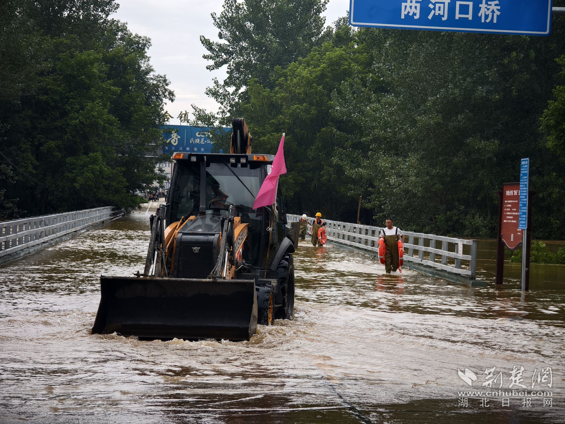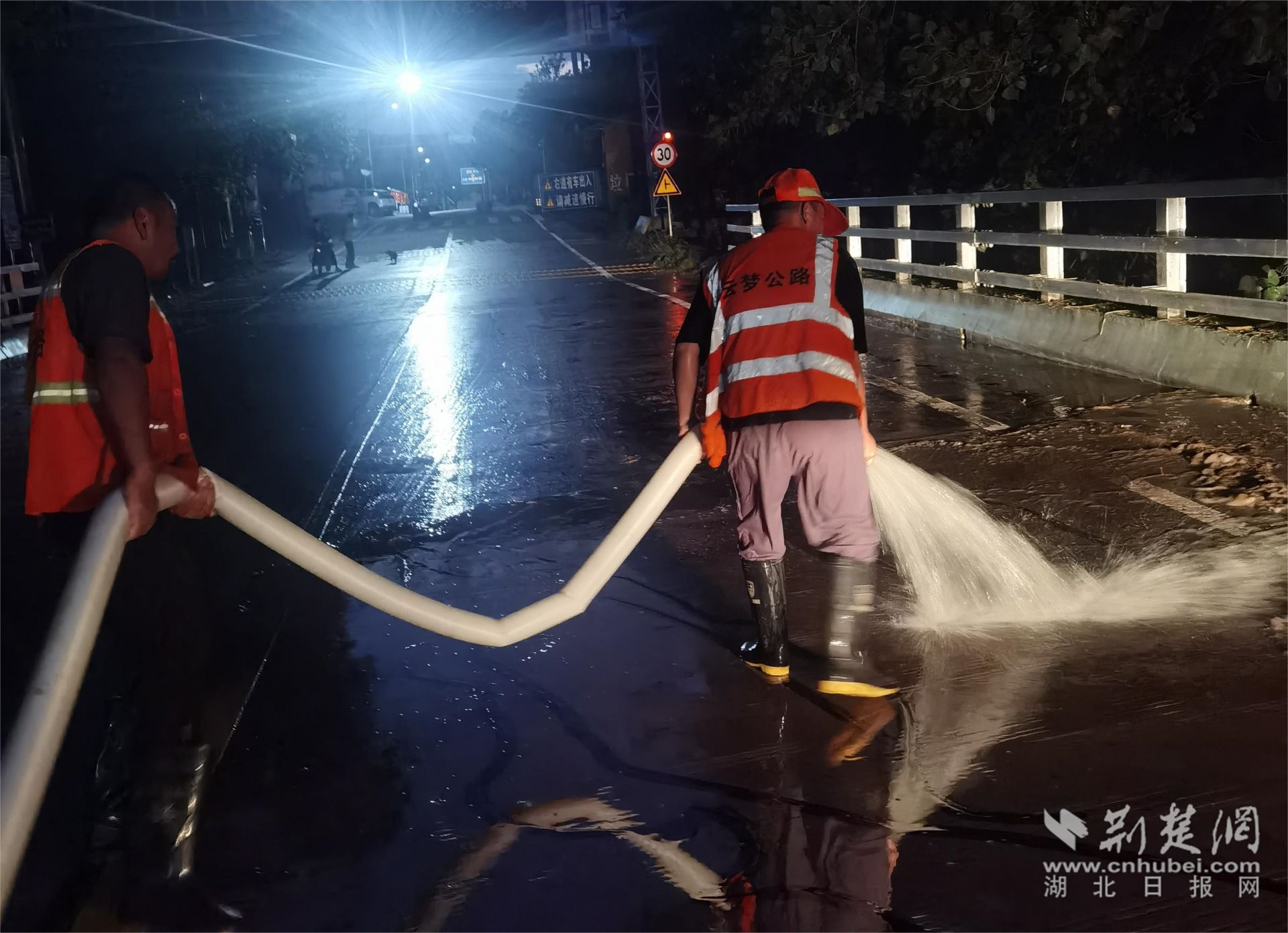 荊楚網(wǎng)(湖北日?qǐng)?bào)網(wǎng))訊(通訊員王紅霞)7月15日19時(shí)30分,S420清兩線(xiàn)兩河口大橋水位回落至橋面以下,云夢(mèng)縣公路事業(yè)發(fā)展中心迅速組織養(yǎng)護(hù)職工對(duì)橋面進(jìn)行泥漿沖洗保潔,經(jīng)過(guò)半個(gè)小時(shí)的緊張作業(yè),至20點(diǎn)零5分,兩河口大橋全面開(kāi)放,暢通無(wú)阻。