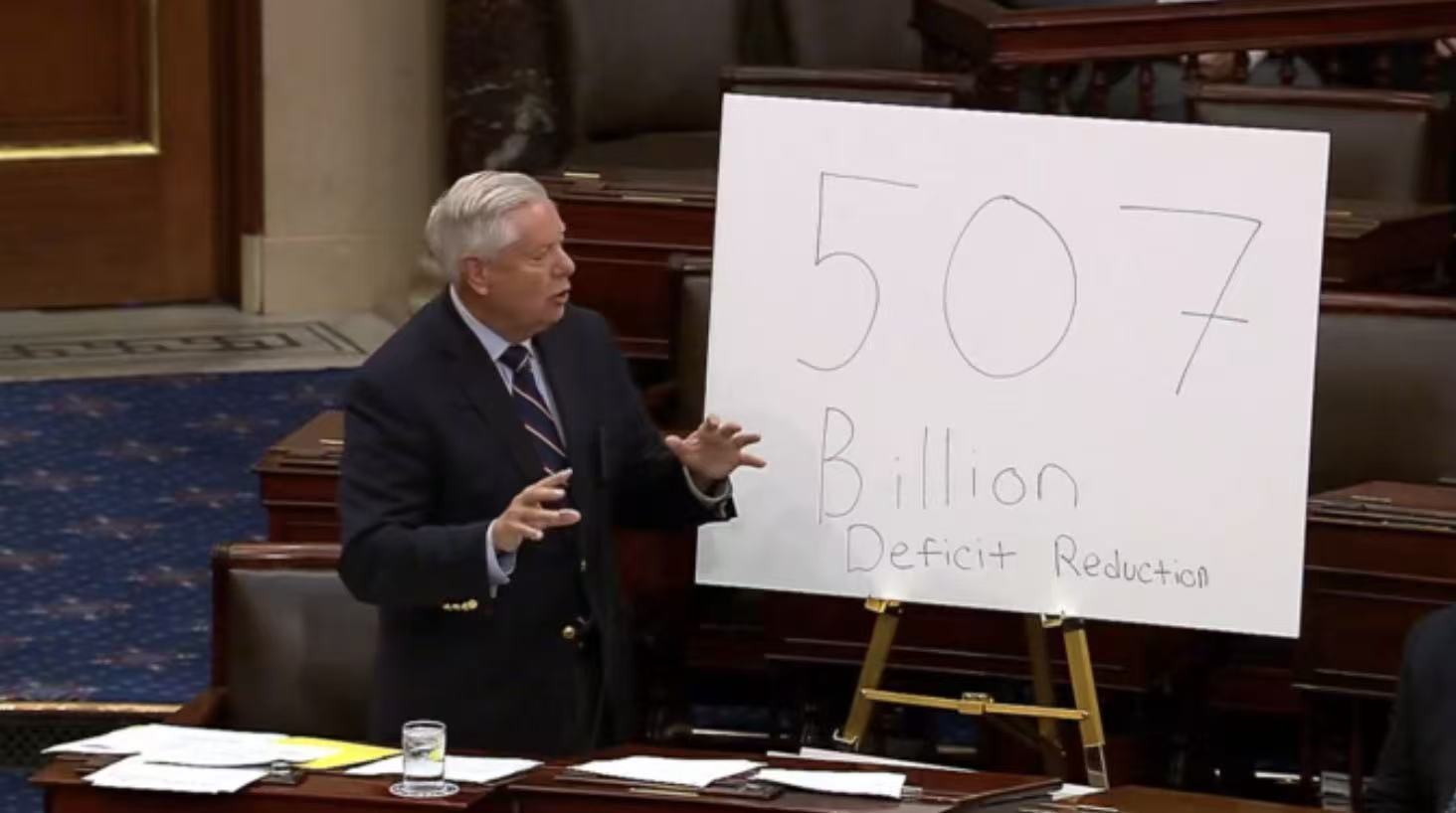 當(dāng)?shù)貢r間6月29日下午,美國參議院預(yù)算委員會主席林賽·格雷厄姆(南卡羅來納州共和黨人)在參議院攜帶手繪圖板上臺,展示國會預(yù)算辦公室(CBO)的一項新評估,宣稱共和黨版本的“大而美”法案若按“當(dāng)前政策基線”估算,將在未來節(jié)省約5000億美元財政支出。