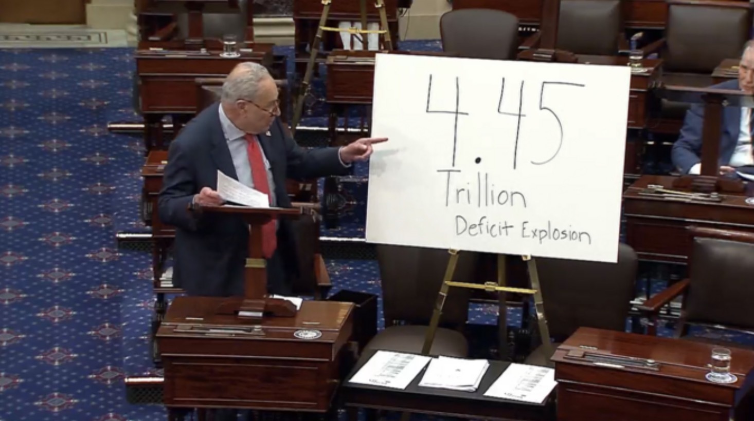 幾個小時后,參議院少數(shù)黨領(lǐng)袖查克·舒默(紐約州民主黨人)也拿著一塊自制紙板上臺,還擊稱該法案實際上將增加4.45萬億美元聯(lián)邦赤字。