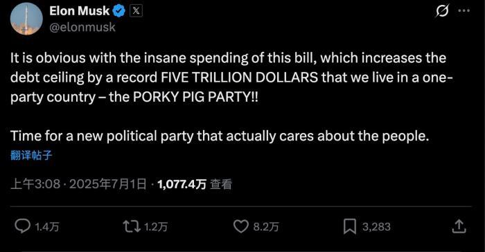 馬斯克還在發(fā)文中批評共和黨。他還稱,是時候建立一個真正關(guān)心美國人民的新政黨了。