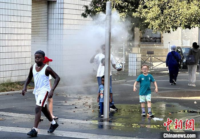 當?shù)貢r間7月1日,法國巴黎遭遇高溫紅色警報。圖為一群兒童在巴黎郊外的防暑設(shè)施周圍活動。中新社記者 李洋 攝