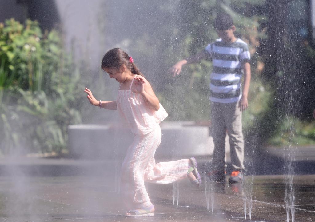 7月3日,在奧地利維也納,孩子們?cè)谝惶巼娙b置旁玩耍。(新華社記者賀燦鈴攝)
