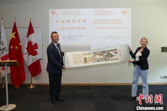 當(dāng)?shù)貢r間7月4日,加拿大多倫多,在中國駐多倫多總領(lǐng)館與加拿大約克大學(xué)聯(lián)合舉辦的“中加教育交流——留學(xué)中國代際對話”活動中,中國駐多倫多總領(lǐng)事羅偉東(左)向約克大學(xué)教務(wù)長、學(xué)術(shù)副校長麗莎·菲利普斯贈送《清明上河圖》(局部圖)?!≈行律缬浾?余瑞冬 攝