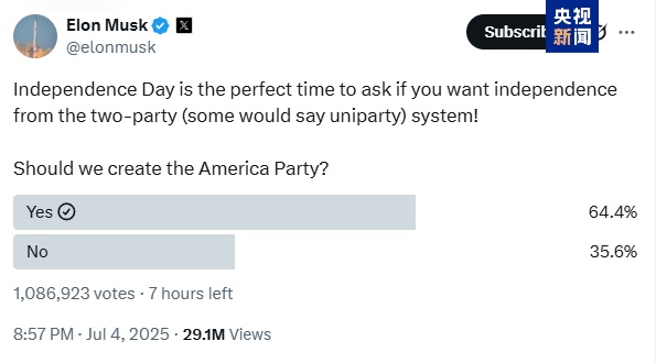 當(dāng)?shù)貢r(shí)間7月4日,馬斯克再次在社交平臺(tái)上發(fā)布有關(guān)建立新黨派“美國(guó)黨”的投票。截至目前,已經(jīng)有超過(guò)108萬(wàn)個(gè)賬號(hào)參與投票,其中64.4%選擇了“是”,35.6%選擇了“否”。