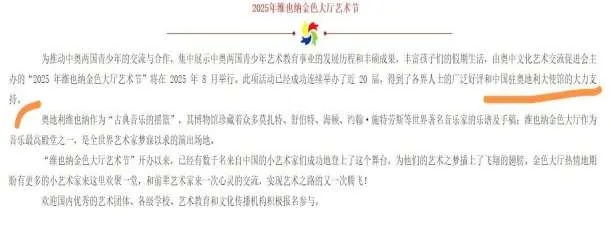 央視網(wǎng)消息:據(jù)中國(guó)駐奧地利使館微信公眾號(hào)消息,近日,抖音和網(wǎng)絡(luò)上出現(xiàn)某“金色大廳藝術(shù)節(jié)”相關(guān)信息,聲稱“衷心感謝中國(guó)駐維也納大使館和各界朋友的大力支持!”中國(guó)駐奧地利使館對(duì)此鄭重聲明,對(duì)該活動(dòng)不知情,未以任何形式參與,并保留追究相關(guān)責(zé)任的權(quán)利。