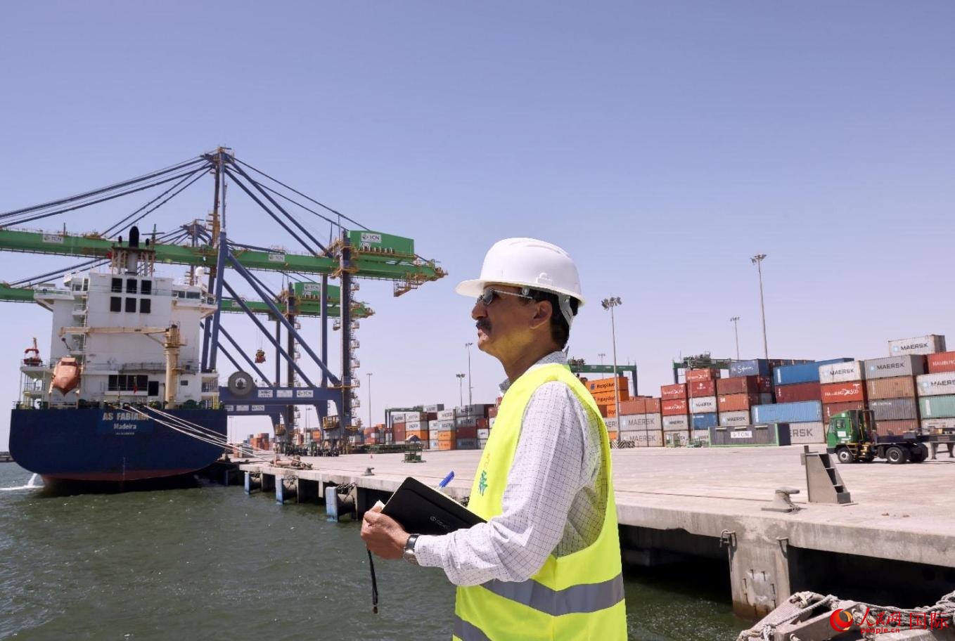 友誼港港務(wù)局局長技術(shù)顧問費薩爾在現(xiàn)場巡視。人民網(wǎng)記者 管克江攝