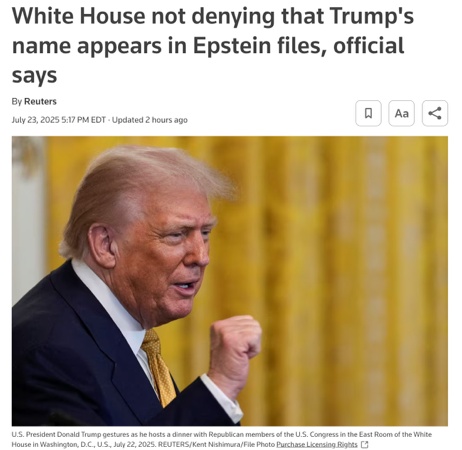 路透社報(bào)道,一名政府官員稱,白宮并未否認(rèn)特朗普總統(tǒng)的名字出現(xiàn)在愛(ài)潑斯坦案的相關(guān)文件中