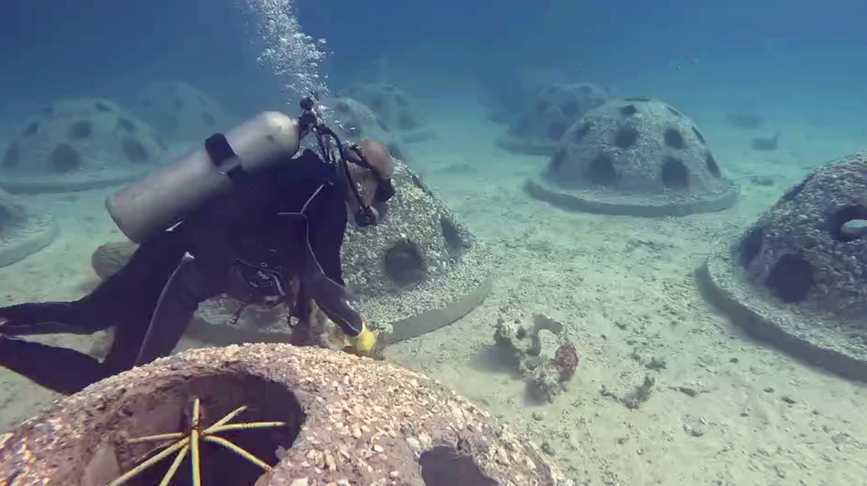 人民網(wǎng)延布8月18日電 (記者管克江)近日,沙特紅海烏姆哈特島外,海底多了上百個(gè)外部呈半圓形、中間有眾多圓形“窗戶(hù)”的鋼混建筑?!斑@是我們?yōu)樾迯?fù)紅海生態(tài)投建的‘珊瑚小屋’?!敝袊?guó)港灣沙特紅海謝巴拉片區(qū)項(xiàng)目負(fù)責(zé)人李偉偉介紹。