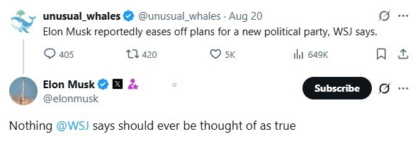 據(jù)《華爾街日報》此前援引知情人士報道,馬斯克已告知盟友,他希望將注意力集中在自己的公司上,并不愿因組建一個可能分流共和黨選民的第三政黨而疏遠有權(quán)勢的共和黨人。