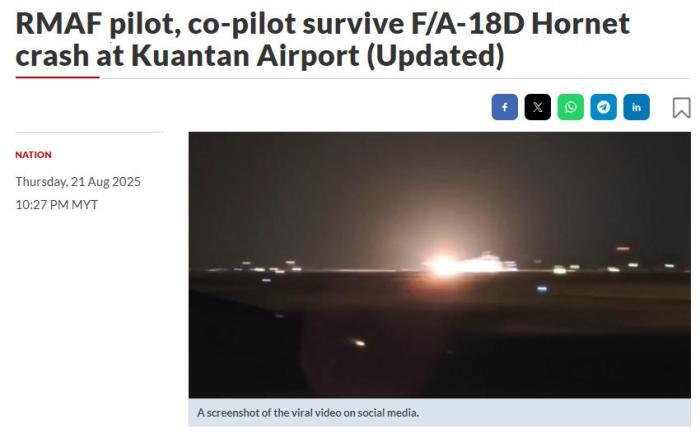 中新網(wǎng)8月22日電 綜合馬來西亞《星報(bào)》等媒體報(bào)道,當(dāng)?shù)貢r(shí)間21日晚間,馬來西亞空軍的一架F/A-18D“大黃蜂”戰(zhàn)斗機(jī)在該國(guó)關(guān)丹空軍基地發(fā)生事故墜毀。