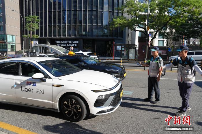 當(dāng)?shù)貢r間8月22日下午,工作人員在首爾明洞地鐵站附近開展針對出租車不良營運行為的整治行動。中新網(wǎng)記者 劉旭 攝