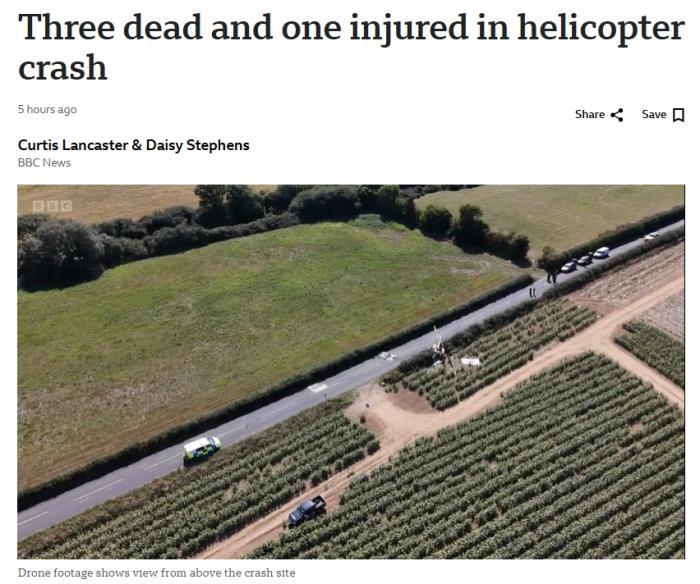 中新網(wǎng)8月26日電 據(jù)英國廣播公司(BBC)報(bào)道,當(dāng)?shù)貢r(shí)間25日,一架直升機(jī)在英國懷特島墜毀,導(dǎo)致3人死亡,1人重傷。