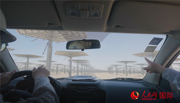 在新疆哈密50兆瓦熔鹽塔式光熱發(fā)電站,工作人員駕駛汽車穿行在定日鏡之間進(jìn)行作業(yè)。人民網(wǎng)記者 袁蒙攝