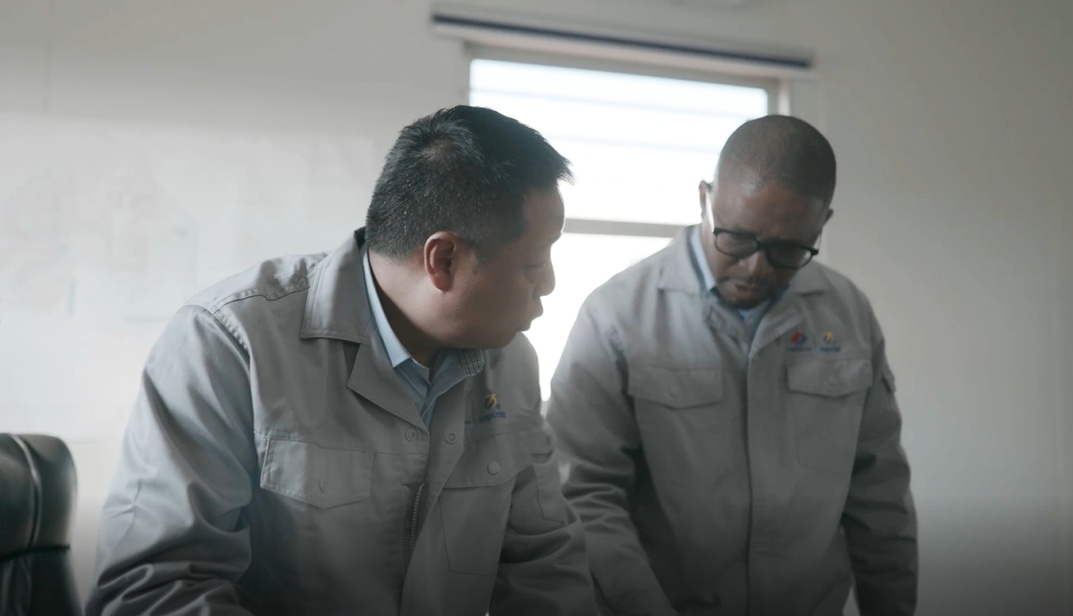 在南非紅石100兆瓦塔式熔鹽光熱電站項(xiàng)目,中方工作人員和南非工作人員一起工作??烁晁鳌っ飞晨恕つ咏B阿攝