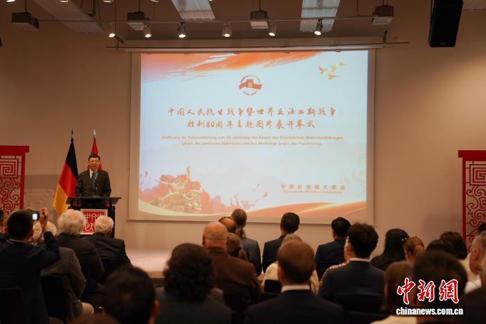 當?shù)貢r間8月26日晚,紀念中國人民抗日戰(zhàn)爭暨世界反法西斯戰(zhàn)爭勝利80周年圖片展在柏林中國文化中心開幕。圖為開幕式現(xiàn)場。中新社記者 馬秀秀 攝