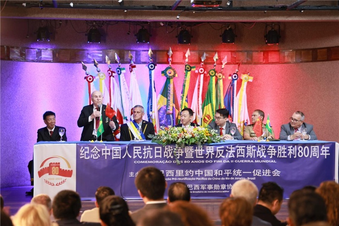 人民網(wǎng)里約熱內(nèi)盧8月28日電 (記者陳一鳴、宋亦然)當(dāng)?shù)貢r(shí)間8月28日,由巴西里約中國(guó)和平統(tǒng)一促進(jìn)會(huì)(以下簡(jiǎn)稱“里約和統(tǒng)會(huì)”)主辦、巴西軍事勛章協(xié)會(huì)協(xié)辦的紀(jì)念中國(guó)人民抗日戰(zhàn)爭(zhēng)暨世界反法西斯戰(zhàn)爭(zhēng)勝利80周年活動(dòng)在里約熱內(nèi)盧科帕卡巴納要塞舉行。中國(guó)駐里約熱內(nèi)盧代總領(lǐng)事王海濤、巴西聯(lián)邦參議員奈·蘇阿蘇納、里約和統(tǒng)會(huì)會(huì)長(zhǎng)林非凡、巴西軍事勛章協(xié)會(huì)主席貝內(nèi)代托·雷吉內(nèi)爾曼,以及巴西軍政界代表、中資機(jī)構(gòu)和留學(xué)生代表、華僑華人社團(tuán)代表等100余人出席活動(dòng)。