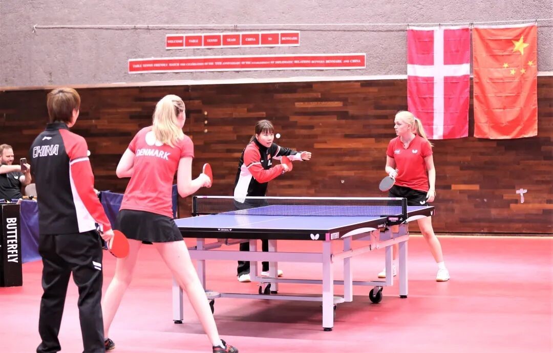 中丹乒乓球運(yùn)動(dòng)員交流互動(dòng)。中國駐丹麥大使館供圖