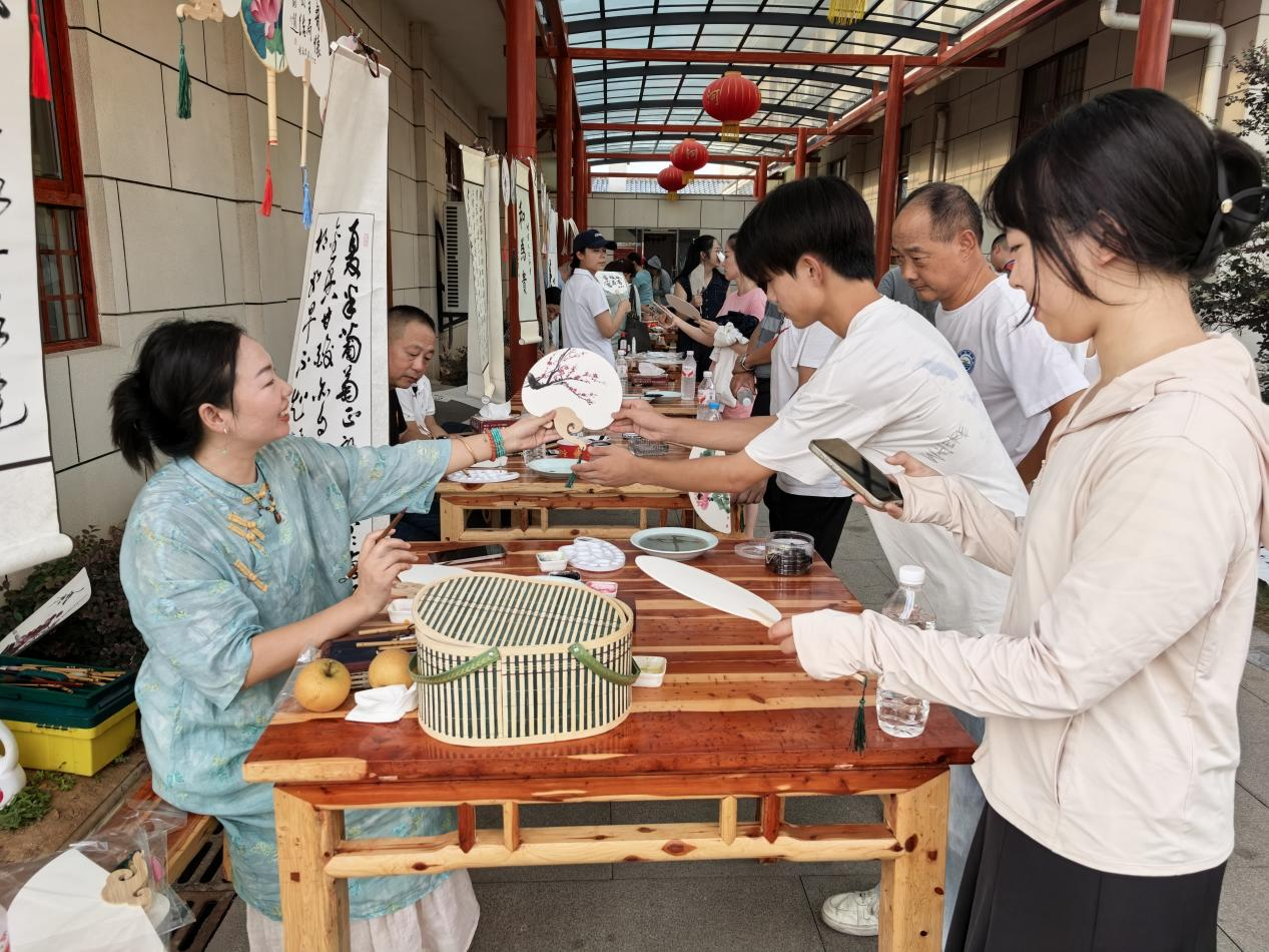 采摘季的熱鬧,不止在葡萄架下。園區(qū)內(nèi)的文化活動區(qū),扇子繪畫與書法桌前圍滿了人。老師們凝神揮毫,有的在扇面勾勒黛色遠山、粉紅梅花,有的書寫“喜樂安康”“清風徐來”,圍觀群眾有序排隊,盼著領走專屬自己的“文化伴手禮”。