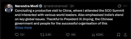 莫迪發(fā)帖稱:“我結束了對中國富有成效的訪問,期間,我出席了上合組織峰會,并與多名國家領導人進行了交流。我還闡述了印度在全球關鍵議題上的立場。感謝中國國家主席習近平、中國政府以及人民成功組織了此次峰會。”