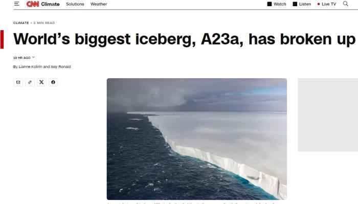 據(jù)報(bào)道,A23a冰山此前重近一萬億噸,面積3672平方公里,自1980年代以來,A23a多次獲得“當(dāng)前最大冰山”的稱號。