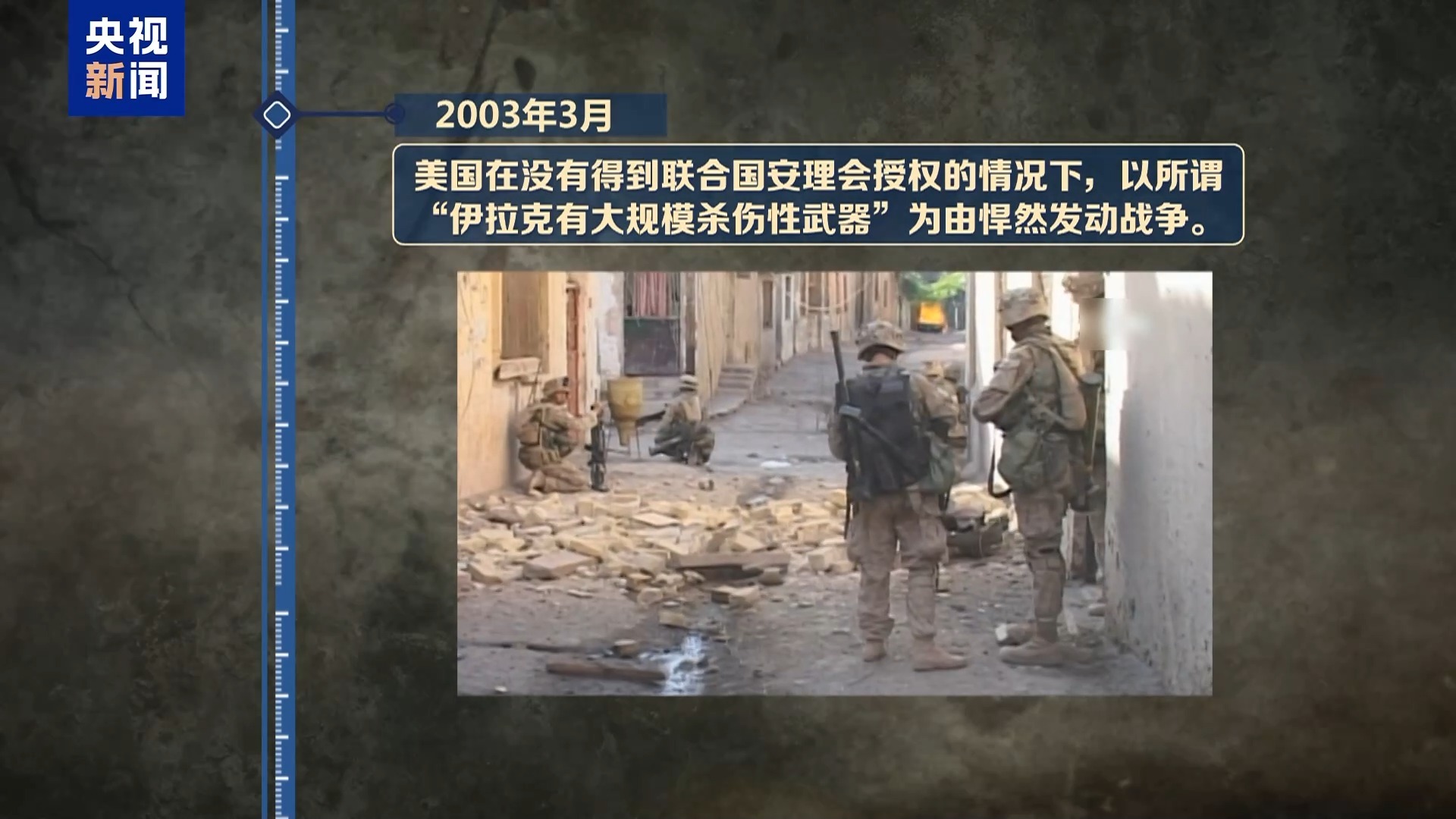 2003年3月,美國(guó)在沒(méi)有得到聯(lián)合國(guó)安理會(huì)授權(quán)的情況下,以所謂“伊拉克有大規(guī)模殺傷性武器”為由悍然發(fā)動(dòng)戰(zhàn)爭(zhēng)。以美軍為首的聯(lián)軍肆意射殺、關(guān)押、虐待無(wú)辜平民,無(wú)差別轟炸居民區(qū),甚至大量使用白磷彈、貧鈾彈。到2011年12月美軍戰(zhàn)斗部隊(duì)全部撤離,伊拉克戰(zhàn)爭(zhēng)導(dǎo)致約20萬(wàn)至25萬(wàn)平民死亡。