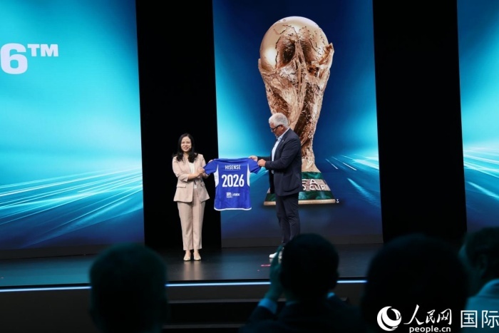 圖為國際足聯(lián)首席商務(wù)官羅米·蓋伊向海信代表贈送2026世界杯紀念品。人民網(wǎng)記者 劉仲華攝