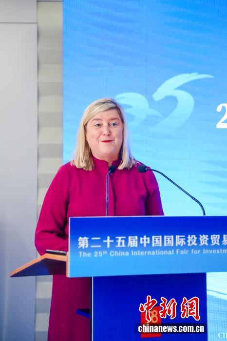 倫敦發(fā)展促進(jìn)署經(jīng)貿(mào)科創(chuàng)產(chǎn)業(yè)董事總經(jīng)理珍妮特·科伊爾(Janet Coyle)9月8日在廈門舉行的2025中英健康創(chuàng)新平臺(tái)投資促進(jìn)活動(dòng)致辭。第二十五屆中國(guó)國(guó)際投資貿(mào)易洽談會(huì)組委會(huì) 供圖