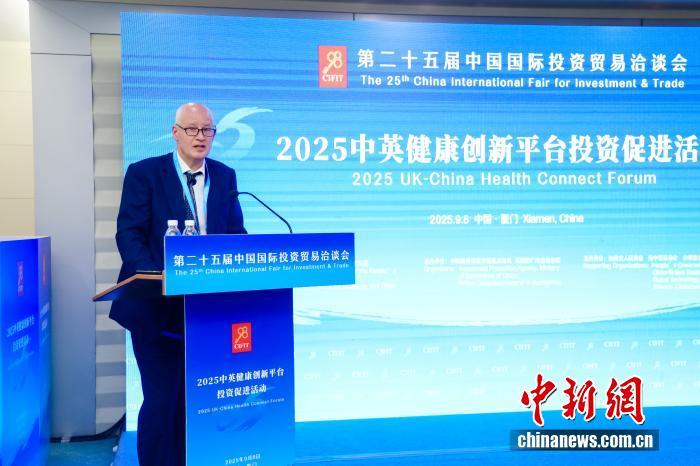 英國(guó)駐華大使魏磊(Peter Wilson)9月8日在廈門舉行的2025中英健康創(chuàng)新平臺(tái)投資促進(jìn)活動(dòng)致辭。第二十五屆中國(guó)國(guó)際投資貿(mào)易洽談會(huì)組委會(huì) 供圖