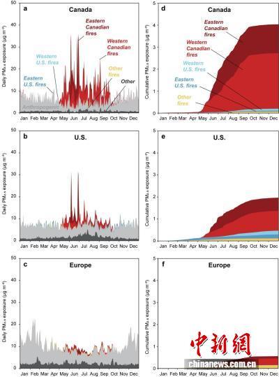 不同來(lái)源野火對(duì)2023年加拿大、美國(guó)和歐洲地區(qū)人群逐日PM2.5污染暴露水平貢獻(xiàn)的示意圖。張強(qiáng) 供圖
