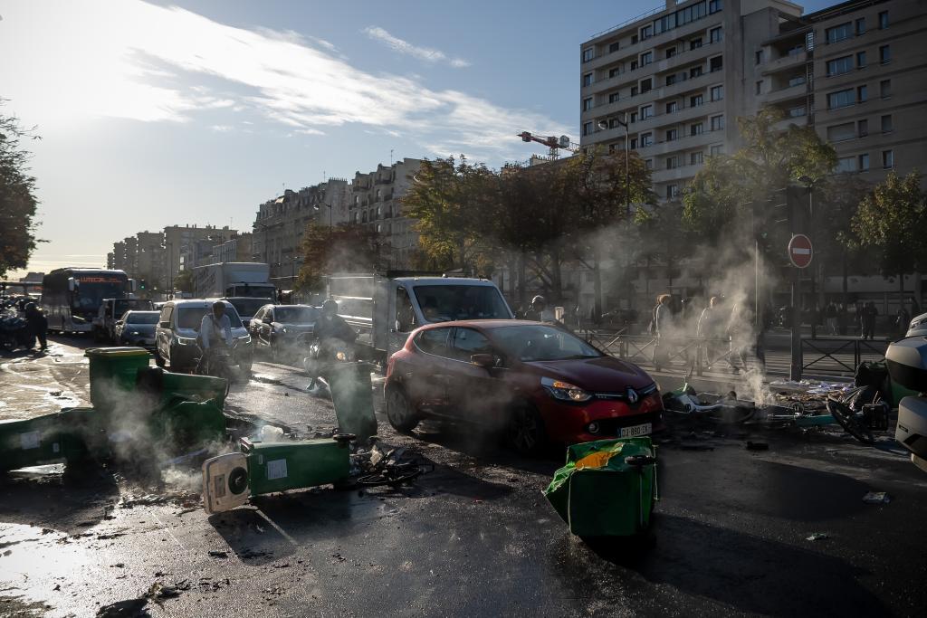 9月10日,在法國巴黎街頭,示威者用垃圾桶封鎖道路。新華社發(fā)(奧雷利安·莫里薩爾攝)