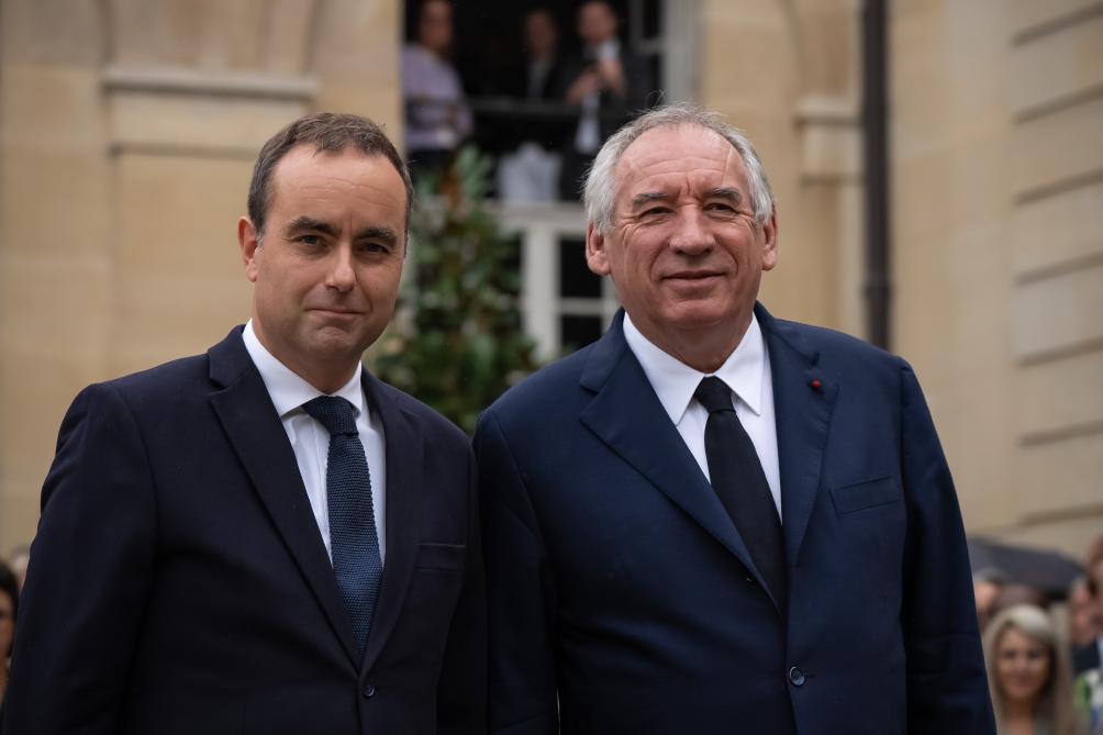 9月10日,在法國巴黎總理府,法國卸任總理貝魯(右)與新任總理勒科爾尼出席交接儀式。新華社發(fā)(奧雷利安·莫里薩爾攝)