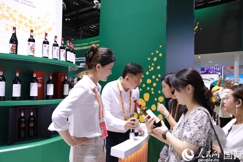 觀眾在澳大利亞國家館咨詢紅酒業(yè)務(wù)。人民網(wǎng)記者 賈文婷攝