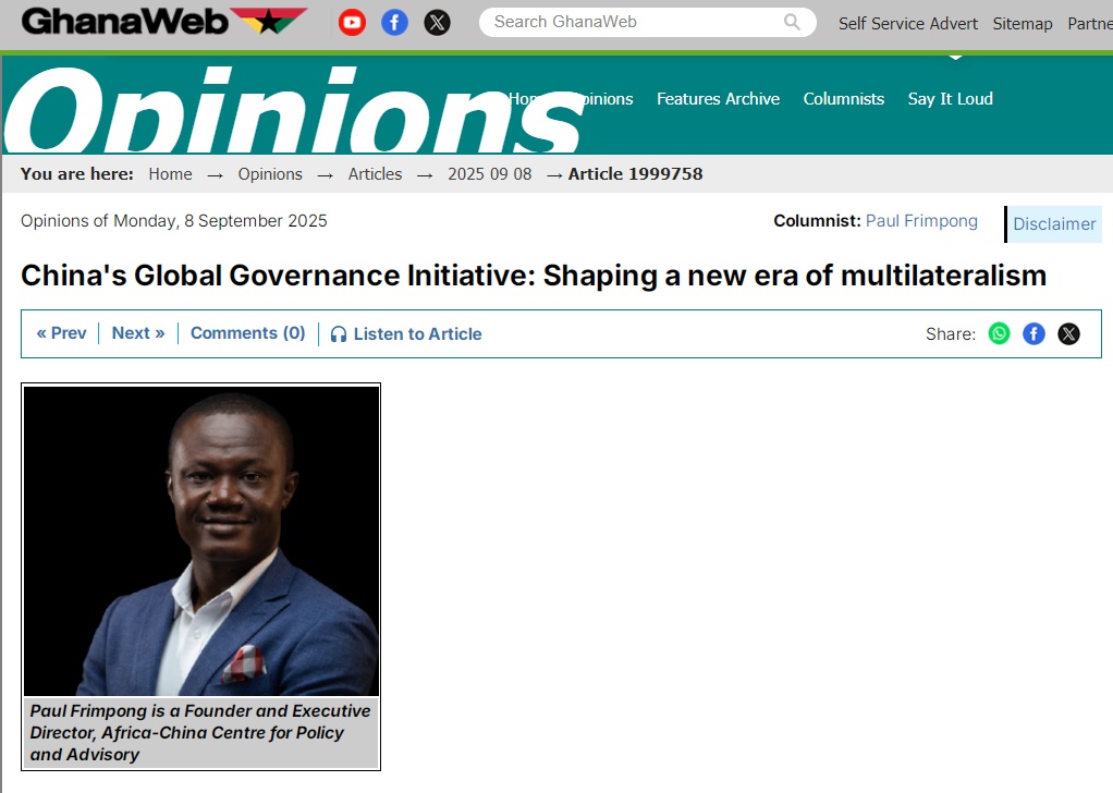 中國日?qǐng)?bào)網(wǎng)9月12日電 加納新聞網(wǎng)站“Ghana Web”9月8日刊發(fā)加納非中政策咨詢中心執(zhí)行主任保羅·弗林蓬的署名文章《中國全球治理倡議:塑造多邊主義新時(shí)代》,對(duì)中國提出的全球治理倡議予以高度評(píng)價(jià)。