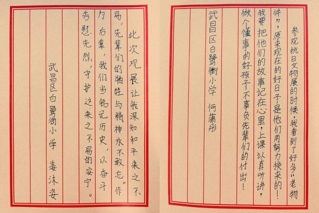 第一次這么近距離接觸抗戰(zhàn)文物,知道了很多抗戰(zhàn)英烈的故事,這些是我們在課本里接觸不到的。通過這節(jié)課我更加明白了,今天幸福生活的來之不易。以后要好好學(xué)習(xí),報效祖國。
