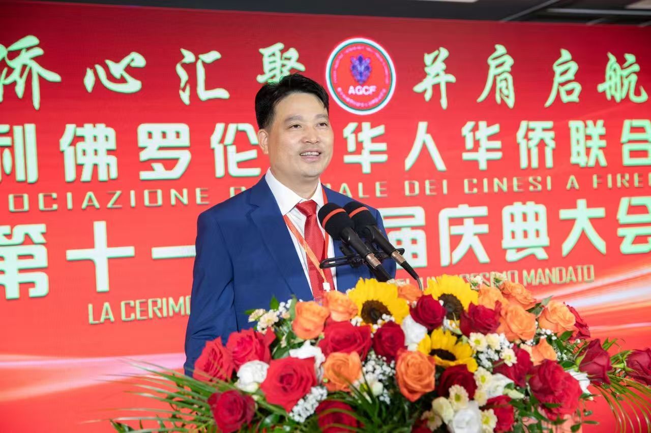 意大利佛羅倫薩華人華僑聯(lián)合總會(huì)新任會(huì)長鄭再生致辭。 主辦方供圖