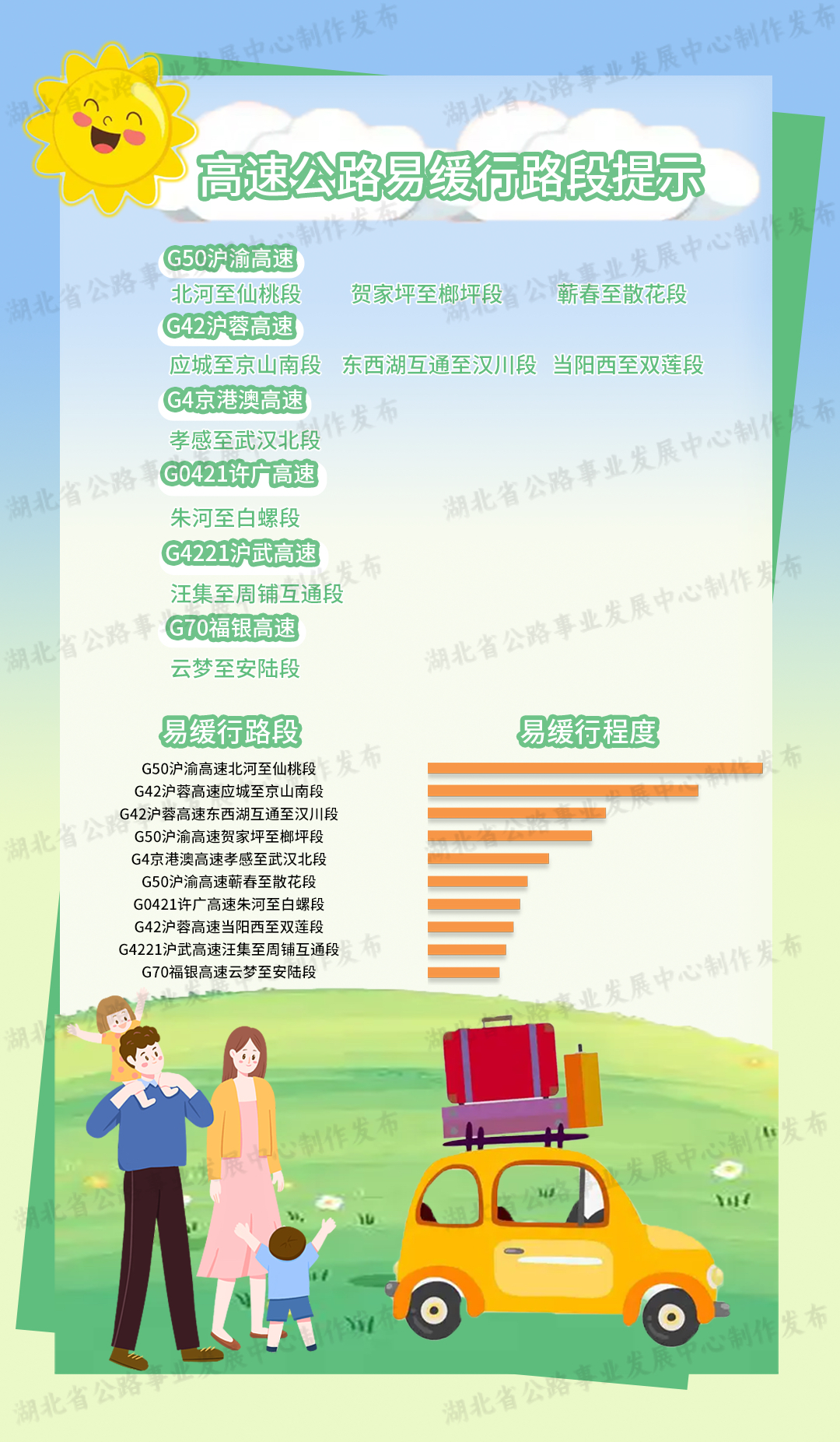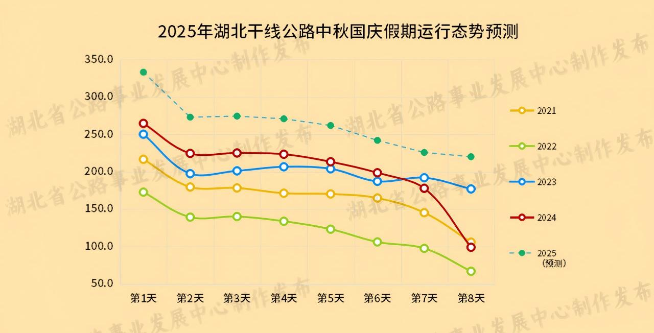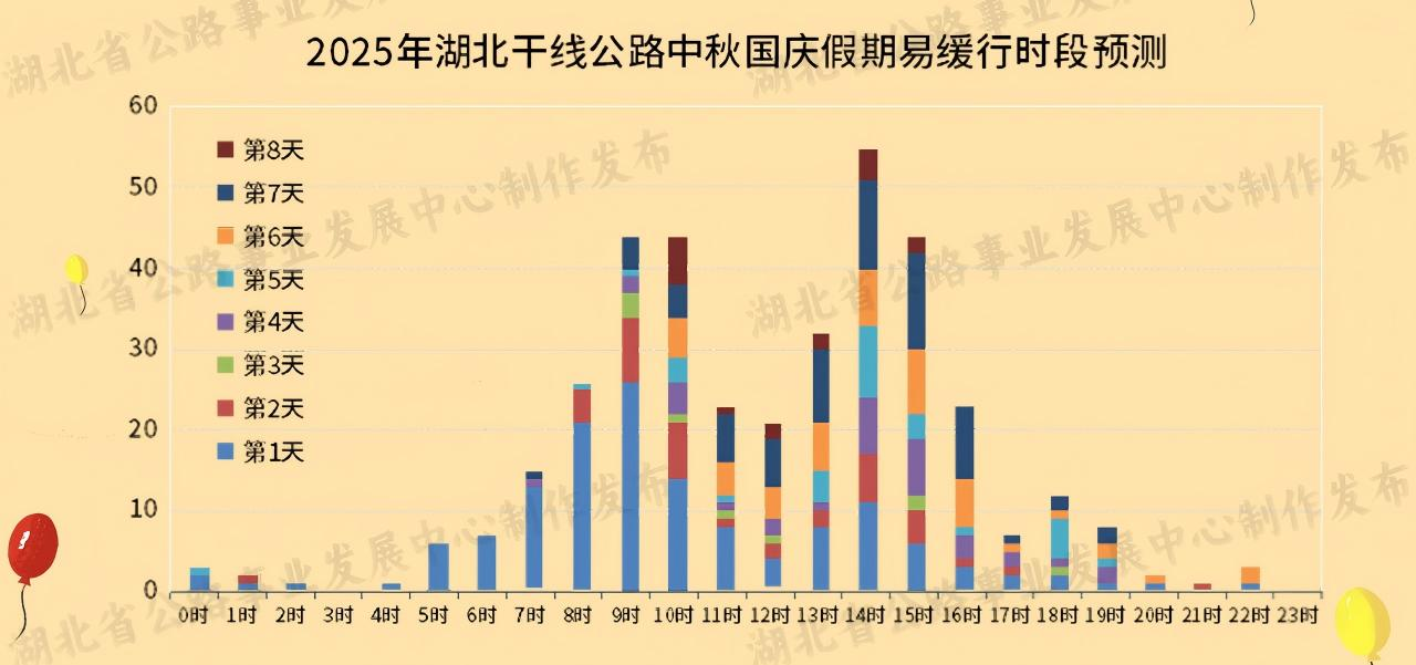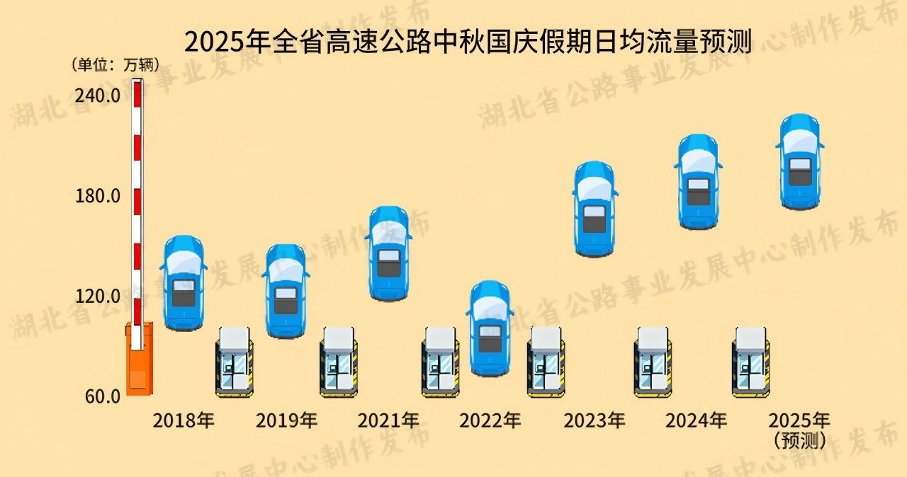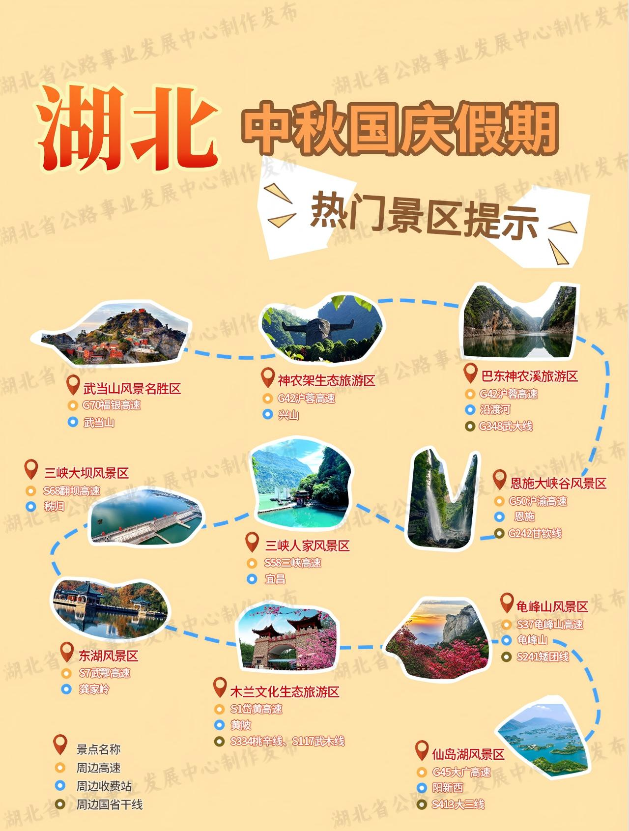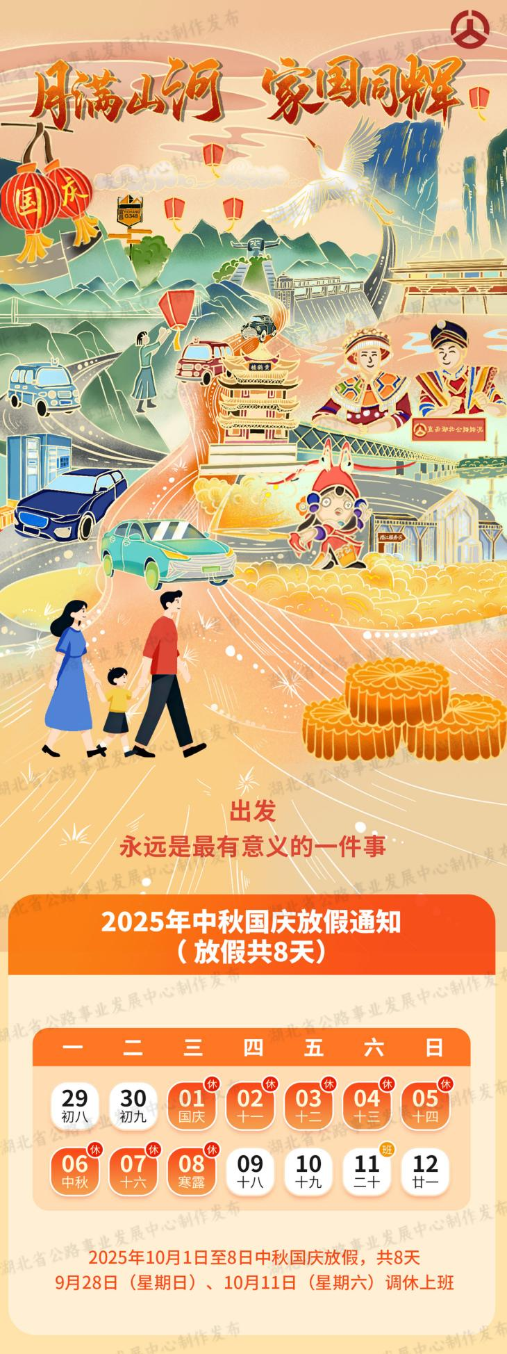 2025年中秋國慶假期即將到來,放假時間為10月1日至10月8日。根據(jù)國務(wù)院發(fā)布的《關(guān)于批轉(zhuǎn)交通運輸部等部門重大節(jié)假日免收小型客車通行費實施方案的通知》,中秋國慶假期期間,收費公路對7座及以下小型客車免費通行,免費時間段為10月1日0時至10月8日24時,共計八天。湖北省公路事業(yè)發(fā)展中心根據(jù)歷年來中秋國慶假期全省公路網(wǎng)運行監(jiān)測情況分析,預(yù)計今年中秋國慶期間路網(wǎng)流量較平日大幅增長,社會公眾探親訪友、度假旅游等中短途出行需求將會集中釋放,省內(nèi)各市州周邊路段和通往省內(nèi)知名景區(qū)路段的交通流量將出現(xiàn)明顯增幅,省內(nèi)國高網(wǎng)、國省干線、武漢市周邊路段易出現(xiàn)不同程度的擁堵緩行?,F(xiàn)編制《2025年中秋國慶假期湖北省干線公路出行指南》,為公眾平安便捷出行提供參考。
