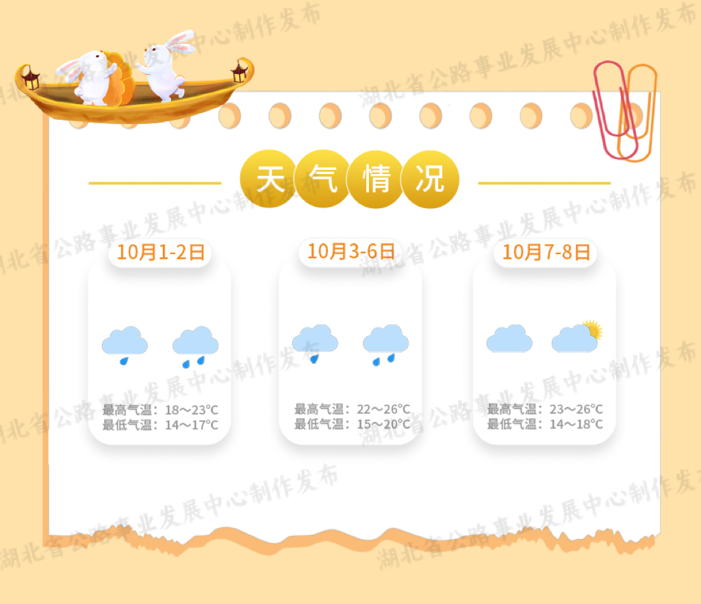 湖北省公路事業(yè)發(fā)展中心經(jīng)與省氣象服務(wù)中心會商研判,預(yù)計中秋國慶假期期間,我省多降水,氣溫有起伏。1日-2日全省有小到中雨,部分地區(qū)有大雨;3-6日全省還將有一次降水過程,省內(nèi)大部地區(qū)小到中雨;7-8日天氣轉(zhuǎn)好,大部陰天到多云,西部有小雨。具體預(yù)報如下:
