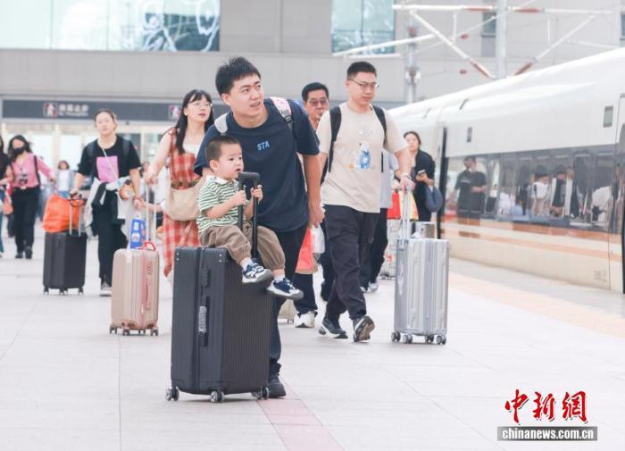 10月1日,國慶中秋假期首日,家長帶著孩子在北京北站乘車。當(dāng)日,中國鐵路迎來國慶中秋假期客流最高峰,預(yù)計發(fā)送旅客2300萬人次,計劃加開旅客列車2106列。中新社記者賈天勇攝
