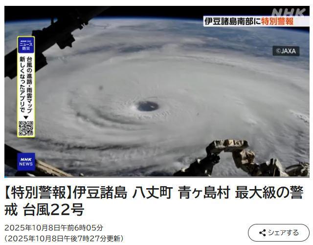 中新網10月8日電 據日本廣播協(xié)會(NHK)報道,2025年第22號臺風“夏浪”將于當?shù)貢r間9日凌晨至早晨接近日本伊豆群島,日本氣象廳已發(fā)布暴風與巨浪的特別警報,指出當?shù)乜赡艹霈F(xiàn)數(shù)十年一遇的大規(guī)模災害。