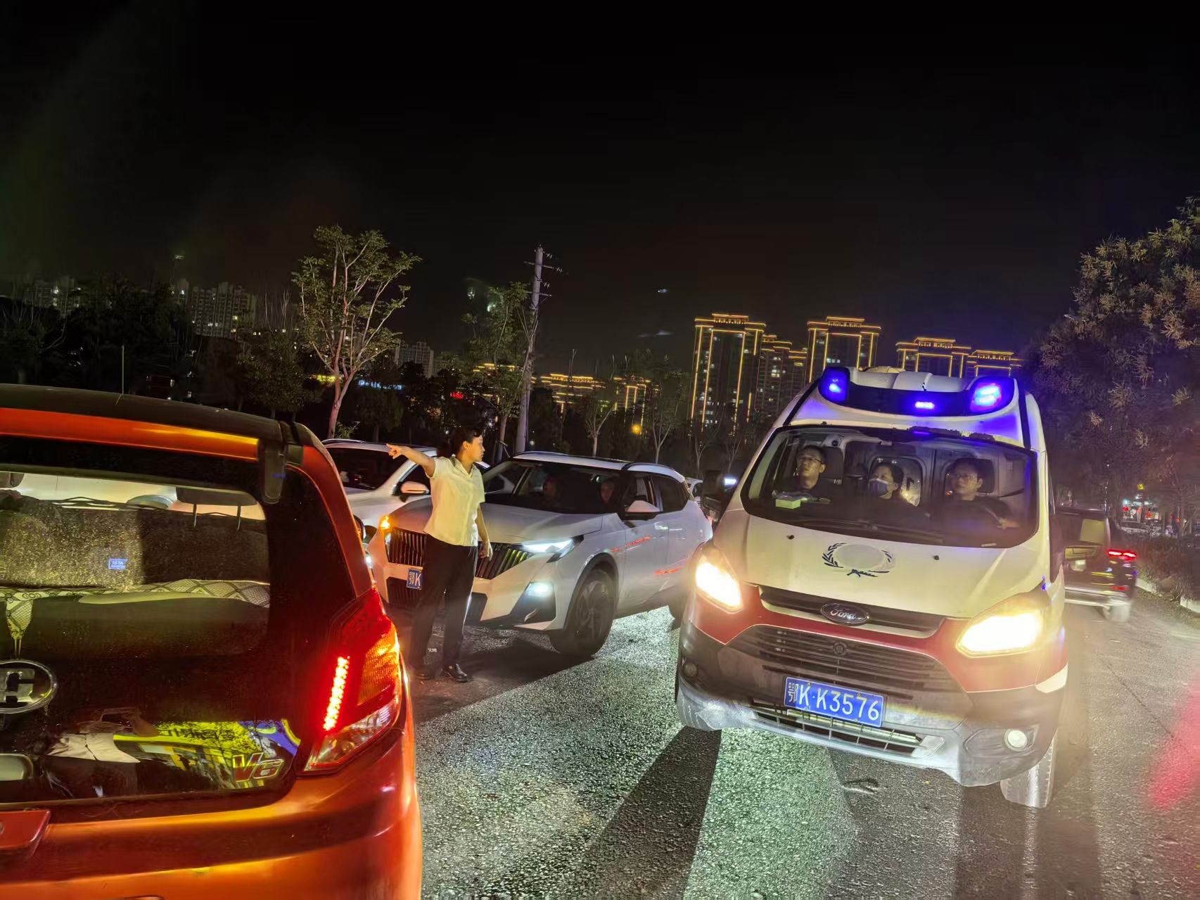 在等待救護車的過程中,兩人始終堅守在現(xiàn)場??吹绞鹿尸F(xiàn)場周邊過往車輛逐漸增多,為避免二次事故發(fā)生,他們主動站在道路兩側(cè),揮手引導(dǎo)車輛減速避讓,維護現(xiàn)場交通秩序。幾分鐘后,救護車呼嘯而至,兩人又第一時間協(xié)助醫(yī)護人員查看傷者狀況,合力將傷者小心翼翼地抬上救護車,直到救護車順利駛離,他們才放心離開。